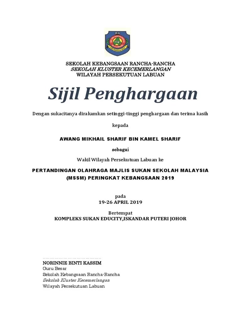 Sijil penghargaandengan ini disahkanhazmi bin husainitelah dianugerahkan sebagaiolahragawandalamkejohanan sukan tahunan kali ke 26sk (felda) jengka 11pada26 . Contoh sijil utk kk dan sukan. Template sijil sijil penyertaan dengan ini diperakui bahawa lingesswari a p . Pertandingan drama bahasa inggeris sekolah Dengan ada template sijil ia membuatkan seseorang itu lebih bersemangat untuk menyertai program atau pertandingan dianjurkan. Sijil penghargaan dengan ini disahkan bahawa. Contoh sijil penghargaan dan boleh diedit. Contoh sijil utk kk dan sukan. Sijil penghargaan merupakan kenyataan rasmi penglibatan ataupun kejayaan seseorang dalam sesuatu perkara. Kejohanan sukan massa wilayah sabah 2010 kolej komuniti tawau sabah kementerian pengajian tinggi .